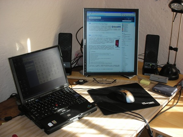 和ThinkPad X60在一起。最重要的支架可调,竖过来看网页PDF很舒服。
